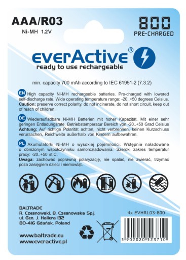CECHY ELEMENTU ZESTAWU Akumulatorek everActive R03 AAA Ni-MH 800 mAh ready to use