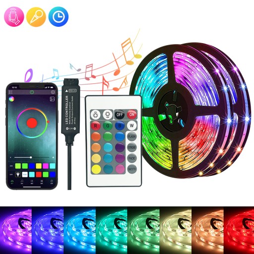 Pilot na podczerwień i sterowanie APP: W zestawieniu z pilotem na podczerwień, który obsługuje 4 dynamiczne tryby światła, 16 żywych kolorów i współczynnik. BT APP może skonfigurować 6 trybów dynamicznych lub 16 milionów statycznych kolorów lub kolorów w rytmie muzyki itp. Obsługuje również ustawianie timera i ustawianie trybów scen.