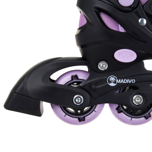 Łożyska klasy ABEC-5 w modelu MADIVO HORIZON to gwarancja płynnej i efektywnej jazdy. Ich wysoka jakość zapewnia minimalne tarcie, co przekłada się na wyższą prędkość i lepszą kontrolę. Kółka wykonane z poliuretanu (kauczuk) są trwałe i zapewniają doskonałą przyczepność, dzięki czemu jazda jest stabilna na różnych rodzajach nawierzchni. Hamulec z TPR usytuowany na prawym bucie dba o bezpieczeństwo podczas jazdy. Ergonomiczna konstrukcja szkieletu skorupy odpowiednio usztywnia stopę, wspierając jednocześnie jej naturalny ruch.