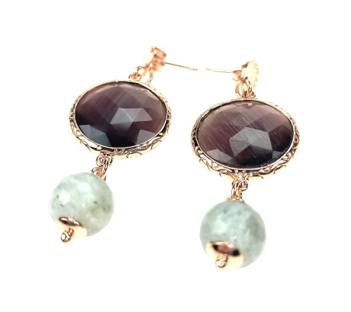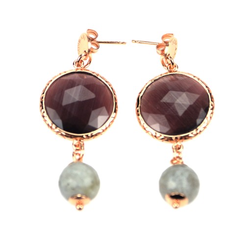 PIĘKNE POZŁACANE RÓŻOWYM ZŁOTEM KOLCZYKI Z MOSIĄDZU W KOLORZE RÓŻOWEGO ZŁOTA, Z RÓŻOWYM KWARCEM, LABRADORYTEM