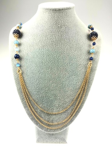 PIEKNY, NASZYJNIK Z MOSIĄDZU POZŁACANY z jasnoniebieskim kocim okiem, akwamarynowym jadeitem i granatowymi kryształami.