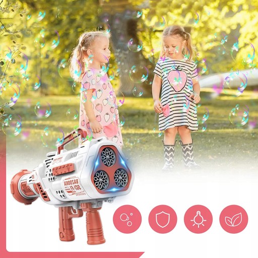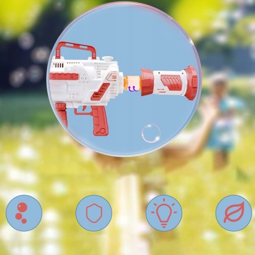 - Wystarczy lekko nacisnąć, karabin maszynowy bazooka może automatycznie rozpylać olśniewające kolorowe bąbelki, którym towarzyszą romantyczne światła.