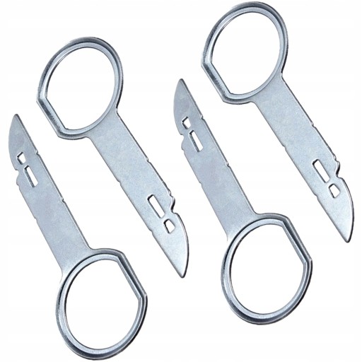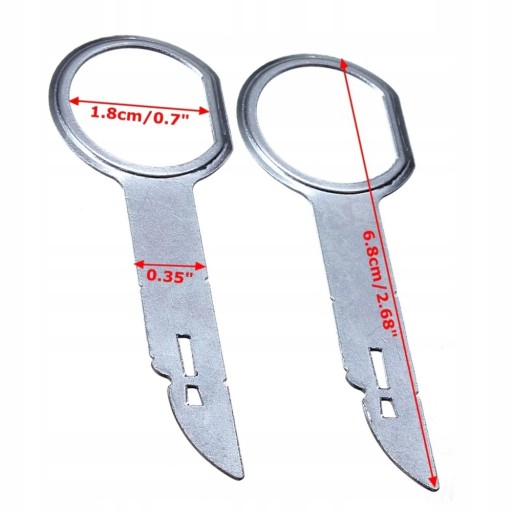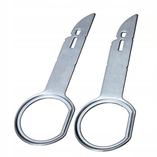 SPECYFIKACJA: Przeznaczenie: Wyciąganie radia samochodowego w markach m.in. Audi, Ford, Mercedes, Seat, Skoda, VW Materiał: Metal Długość: 6.8 cm Ilość: 4 sztuki