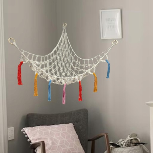 MAKRAMOWY HAMAK ZABAWKOWY: Nasze plecione hamaki siatkowe do zabawek oferują doskonałą równowagę stylu i funkcjonalności dla rodziców, którzy utrzymują porządek w sypialniach niemowląt i małych dzieci, a jednocześnie dodają dekoracyjnego akcentu w rogu pokoju.