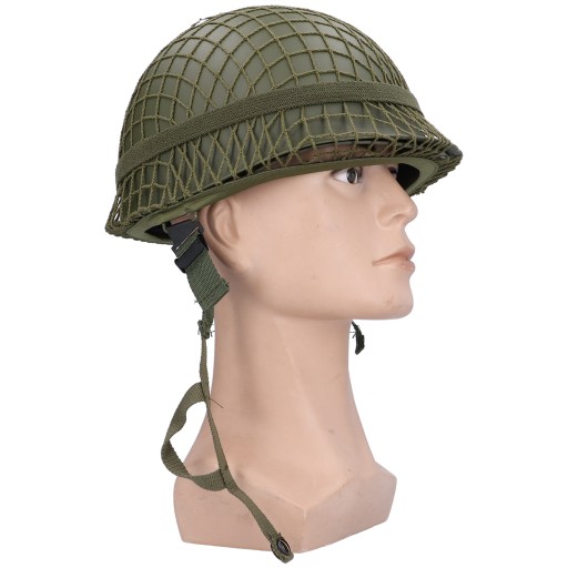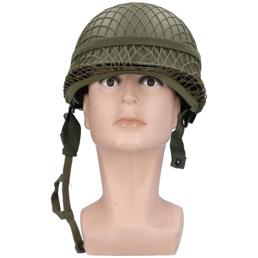 Idealny zielony hełm M1 armii amerykańskiej z II wojny światowej. Klasyczny hełm z II wojny światowej z siatką i paskiem podbródkowym