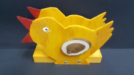 Uroczy serwetnik wykonany ze sklejki z podstawą drewnianą, śliczny kurczaczek.