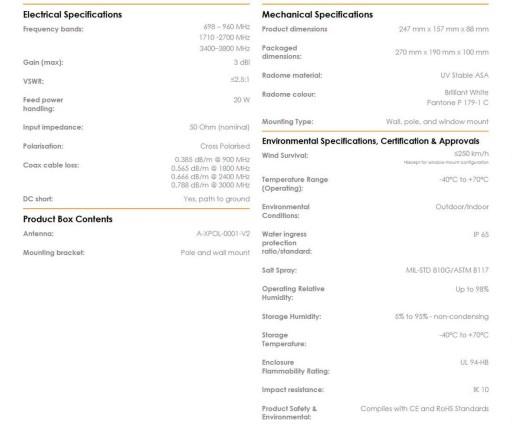 - Ultraszerokopasmowy zakres pracy od 698 do 960 MHz, od 1710 do 2700 MHz oraz od 3400 do 3800 MHz;