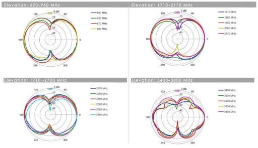 3 dBi to wzmocnienie szczytowe dla wszystkich pasm od 698 do 3800 Mhz: powyższy wykres z prawej strony obrazuje wzmocnienie w każdym z zakresów pracy.