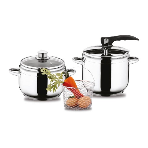 Prezentujemy doskonały, 5 elementowy zestaw z szybkowarem. Zaletą szybkowaru jest skrócenie czasu gotowania o 60%. Jest to możliwe poprzez wykorzystanie pary i podwyższonego ciśnienia podczas gotowania. Dzięki temu potrawy zachowują swój naturalny smak, aromat i składniki odżywcze które, przy zwykłym gotowaniu, po prostu ulatują z parą. Dodatkowymi zaletami szybkowarów jest oszczędność energii poprzez skrócenie czasu gotowania oraz możliwość mycia ich w zwykłych zmywarkach. Opatentowana kompozycja warstw specjalnego stopu oraz wysokogatunkowej stali szlachetnej doskonale przewodzi i akumuluje ciepło, a także odpowiednio zabezpiecza gotowane potrawy przed przypaleniem oraz chroni naczynie przed zużyciem.