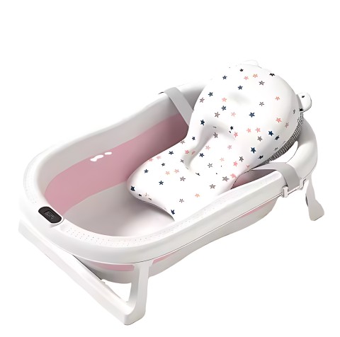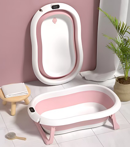 СКЛАДНАЯ ДЕТСКАЯ ВАННОЧКА С ТЕРМОМЕТРОМ И ПОДУШКОЙ, СИЛИКОН, РОЗОВЫЙ, LCD