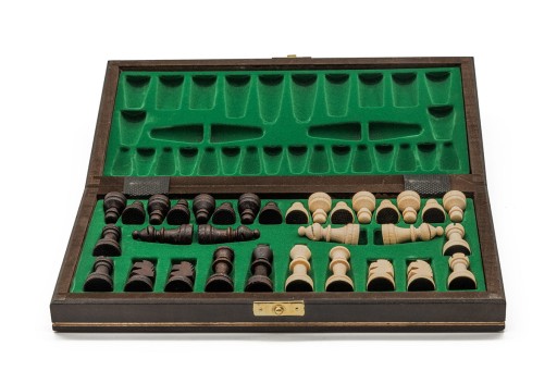 Komplet stanowi kaseta z planszą szachową, zestaw figur szachowych w kolorach białym i brązowym po 16 elementów w każdym.