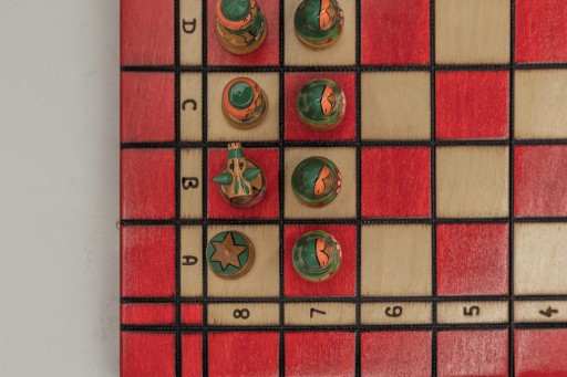 Linie oddzielające pola jasne od ciemnych są wypalone ręcznie rozżarzonym drutem. Oznaczenia literowe i numeryczne oraz ozdobne ornamenty na boku kasety wykonane są techniką pirografii. Pola kolorowe pomalowane są ręcznie bejcą o odpowiedniej barwie, następnie zostały pokryte lakierem.