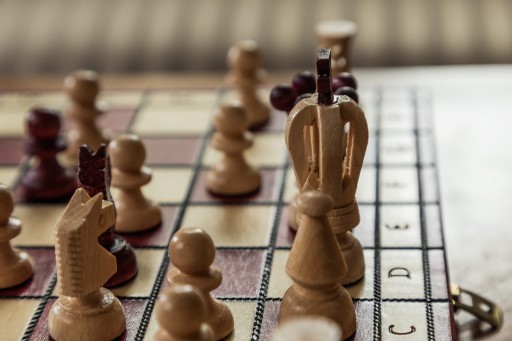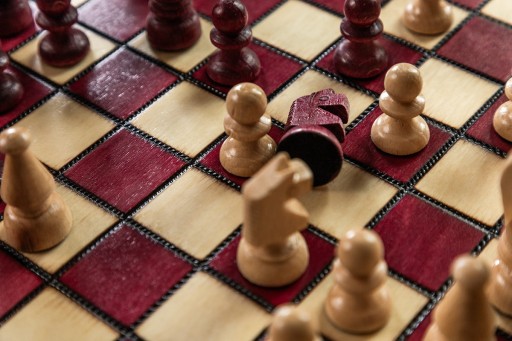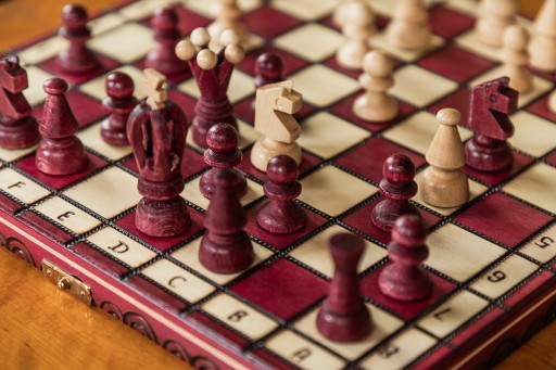 Komplet stanowi kaseta z planszą szachową, zestaw figur szachowych w kolorach białym i wiśniowym po 16 elementów w każdym.