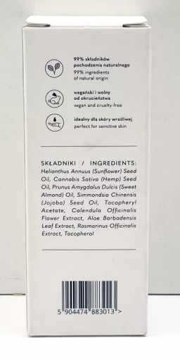 W tym olejku znajdziesz aż 99,5% składników pochodzenia naturalnego! Olej ze słodkich migdałów zapewnia nawilżenie i odżywienie, olej z nasion konopi działa regenerująco, a olej jojoba wspomaga ujędrnienie i elastyczność skóry. Jego delikatna konsystencja pozwala mu łagodnie przemieszczać się po ciele, odżywiając każdy centymetr skóry - nie pozostawia tłustego filmu, plam ani uczucia suchej, ściągniętej skóry. Olejek intymny Your KAYA nie posiada zapachu, ponieważ substancje zapachowe mogą potencjalnie wywoływać reakcje alergiczne i podrażniać wrażliwą skórę.