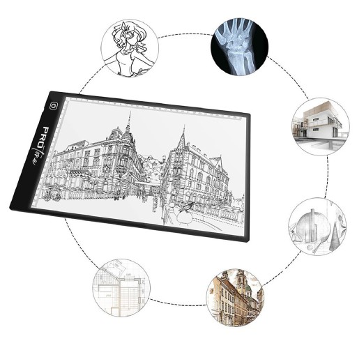 Produkt jest bardzo lekki, a jego grubość wynosi około 4 mm. W połączeniu z twardym akrylowym wykończeniem bardzo przyjemnie się nim operuje. Rysunki można wykonywać np. siedząc czy opierając tablicę na kolanach. Twarda powierzchnia pozwala również przymocować rysunki do deski za pomocą klamerek zaciskowych. Wbudowane diody LED generują bezpieczne dla oka oświetlenie, dzięki czemu oczy nie będą się tak męczyć podczas wykonywania rysunku.