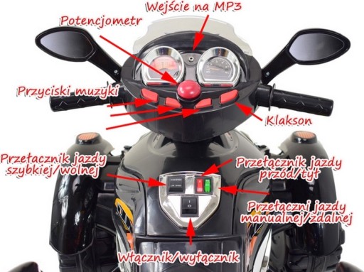 - w kierownicy klakson, dźwięk odpalania i pracy silnika oraz różne melodyjki ( 3 piosenki),