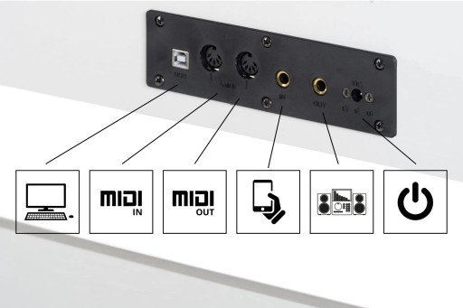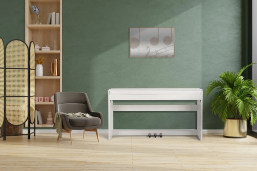 Pianino elektryczne w matowej białej obudowie z 88 klawiszami z mechaniką młoteczkową i dynamiką naciśnięcia klawiszy. Dostępnych jest 128 dźwięków, 600 akompaniamentów, polifonia 128 , funkcja layer i dual oraz 3 pełnowymiarowe pedały.