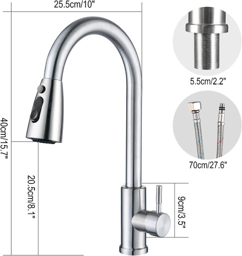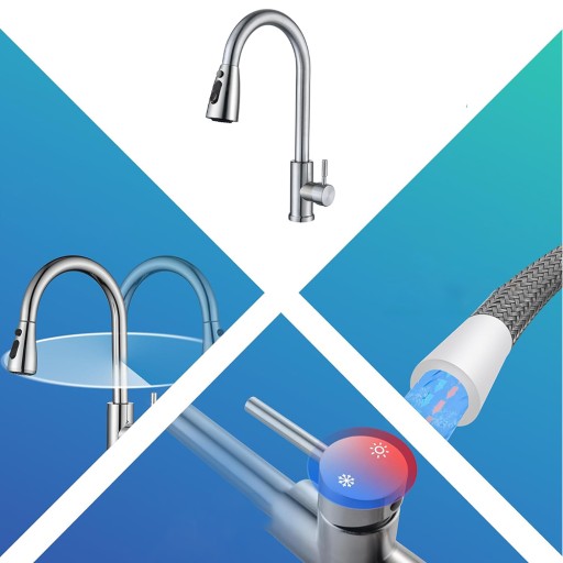💧 Wyciągany kran kuchenny wykonany jest z wysokiej jakości stali nierdzewnej 304, która jest odporna na starzenie, wysokie ciśnienie i szczelność.