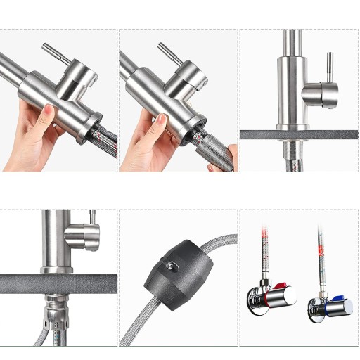 💧 Nasz kran kuchenny można łatwo podłączyć do wszystkich systemów ciśnienia wody (lewy gorący i prawy zimny). Aby zainstalować ten kran kuchenny, możesz postępować zgodnie ze szczegółową instrukcją instalacji.