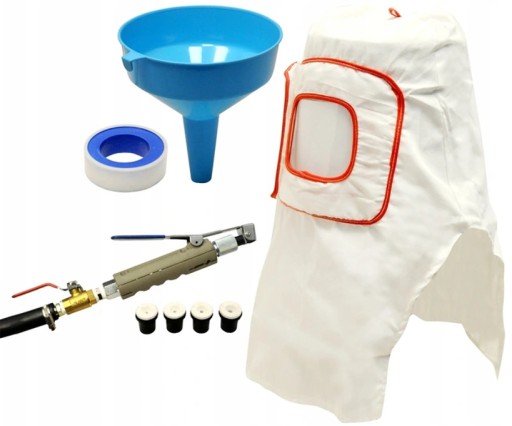 W zestawie, wraz z piaskarką, znajdują się ceramiczne dysze do piaskowania, taśma teflonowa oraz ochronna maska do piaskowania.