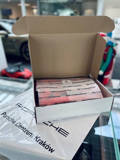 Jeżeli Pański zakup jest prezentem dla kogoś innego, zachęcamy do skorzystania z opcji pakowania prezentowego. W skład którego wchodzi jeszcze ozdobna wstążka i kokarda Porsche.