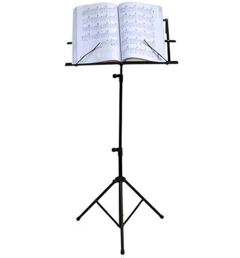 Profesjonalny, stalowy pulpit do nut osadzony na metalowym trójnogu z płynną regulacją wysokości i składanym stalowym pulpitem