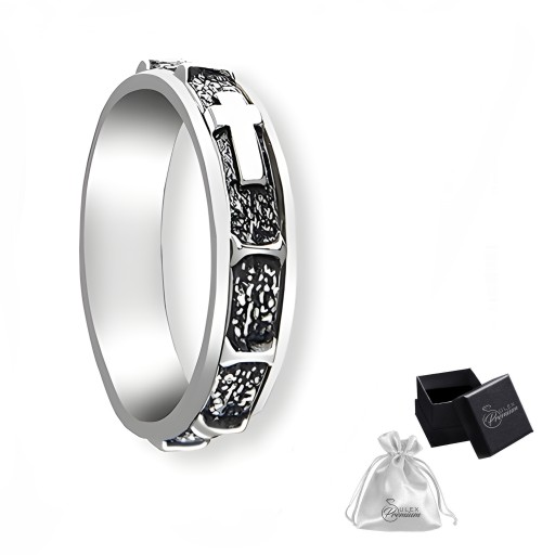 Srebrna obrączka różaniec antystresowa wykonana z najwyższej jakości srebra próby 925. Obrączka posiada wytłoczone paciorki symbolizujące koraliki różańca oraz krzyżyki oddzielające tajemnice. Ciemne akcenty w zagłębieniach podkreślają szczegółowe zdobienia, nadając obrączce unikalny i elegancki wygląd. Funkcja antystresowa pozwala na swobodne obracanie zewnętrznej części, co pomaga w redukcji napięcia i stresu.