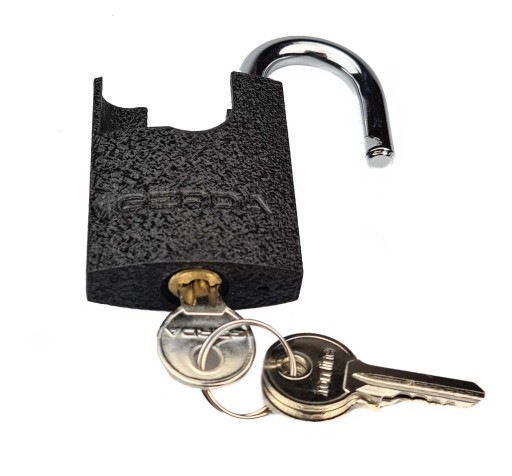 Pałąk został wykonany z hartowanej stali, pokryty powłoką niklowo-chromową. Korpus żeliwny pokryto powłoką proszkową w kolorze czarnym. W komplecie 3 klucze.