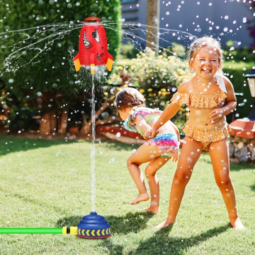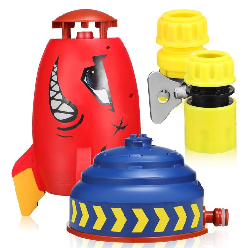 Zraszacz ma zabawny wygląd w kształcie rakiety i jasne kolory, aby przyciągnąć uwagę dzieci.