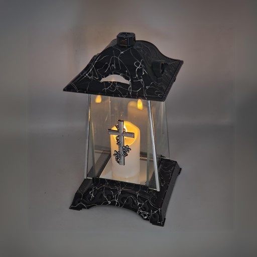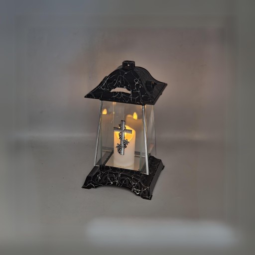 Znicz na Grób Duża Czarna Kapliczka Szklany Lampion Srebrny Krzyż 30 cm