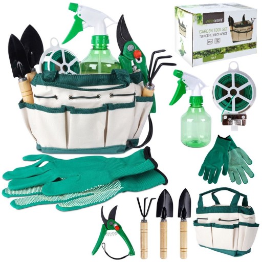 Komplet narzędzi składa się z takich elementów jak łopatki, grabki, skrobak, nożyce do przycinania krzewów, sekator, czy butelka z rozpylaczem. To wszystko o czym marzy każdy miłośnik ogrodnictwa zostało ujęte w jednym praktycznym zestawie.