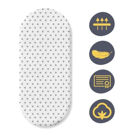 Prześcieradełko jest antyalergiczne i bezpieczne dla wrażliwej skóry niemowląt. Posiada elastyczna gumkę i kształt dopasowany do materaca. Pasuje do większości gondol dostępnych na rynku.
