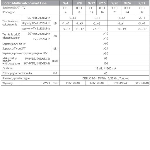 CORAB MULTISWITCH SMART LINE jest to urządzenie służące do rozdzielenia sygnału telewizyjnego, posiada 9 wejść: 8 satelitarnych i 1-dno naziemne oraz 24 wyjścia satelitarno-naziemne.