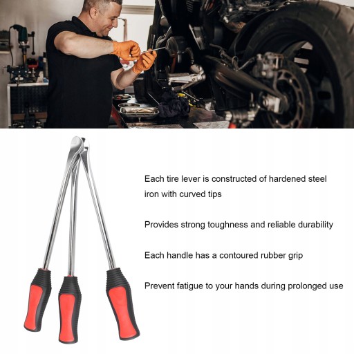 2. WYSOKA WYTRZYMAŁOŚĆ: Każda łyżka do opon jest wykonana z hartowanej stali z zakrzywionymi końcówkami, co zapewnia dużą wytrzymałość i niezawodną trwałość.