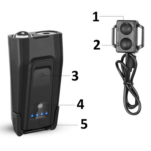 OPIS PRODUKTU Przycisk sterowania światłem. Przycisk klaksonu Przycisk zasilania Czujnik zmierzchu (Uwaga: w celu poprawnego działania czujnik nie powinien być zasłaniany, nie należy go zaklejać oraz należy dbać o to, aby pozostawał czysty). Wskaźnik poziomu naładowania baterii: 25%, 50%, 75%, 100%.
