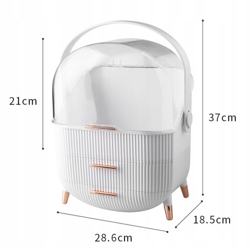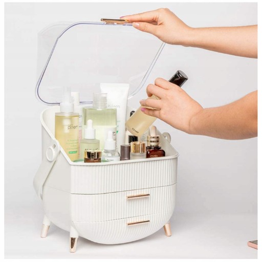 Praktyczny organizator na kosmetyki, produkty lub inne akcesoria dla każdej kobiety. Charakteryzuje się pojemnymi szufladkami oraz dużą gablotką na perfumy, balsamy lub kremy. istnienie istoty ładu i porządku w podręcznych szczegółach.