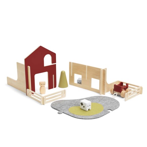 Świat zabawy Farma firmy Micki zawiera: 4 ściany, 1 figurkę, 2 zwierzątka, 4 ogrodzenia, 1 drzewo, 1 przyczepkę, 5 magnesów (słońce, kwiat, widły, kupa i wiadro) oraz dwuczęściową matę do zabawy z filcu.