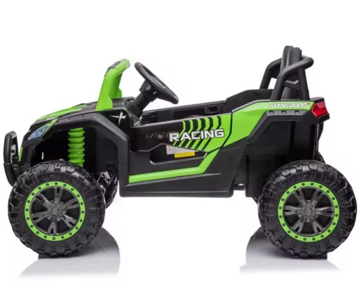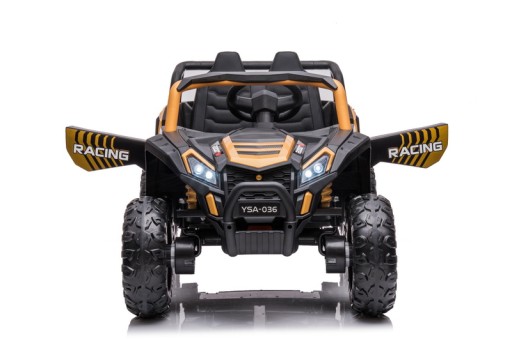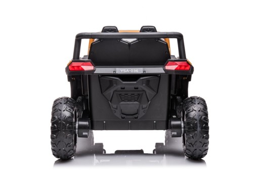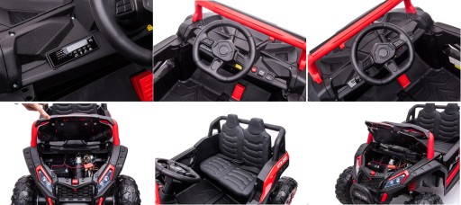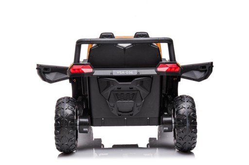 Samochód BUGGY na akumulator. Pojazd posiada otwierane drzwi z obu stron. Napęd zapewniają mu CZTERY potężne silniki elektryczne, zasilane akumulatorem o pojemności 12V10Ah. Na wyposażeniu pojazdu znajdują się uruchamiane przyciskami efekty dźwiękowe, wejście na odtwarzacz MP3, regulator głośności, światła LED. Dostępne są 3 prędkości poruszania (z funkcji pilota). Bezpieczną naukę jazdy zapewnia dołączony pilot zdalnego sterowania, dający rodzicowi pełną kontrolę nad pojazdem. Miękkie piankowe koła EVA + miękkie siedzisko z eko-skóry