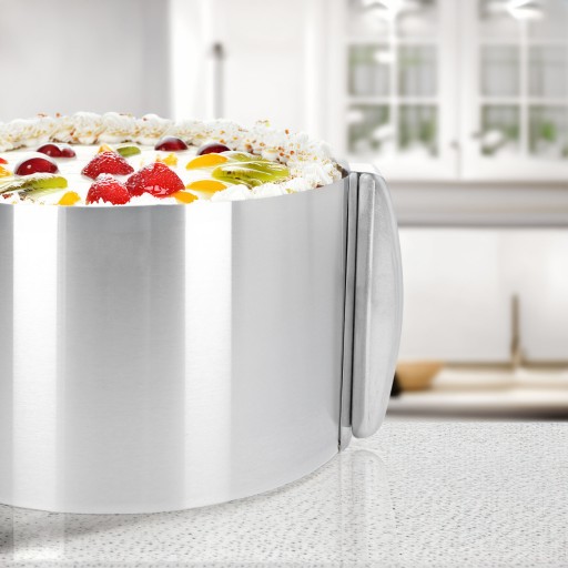 Ta regulowana opaska do tortu z podziałką to niezastąpione narzędzie dla każdego miłośnika wypieków, umożliwiające precyzyjne dopasowanie średnicy tortu i doskonałe wykończenie.