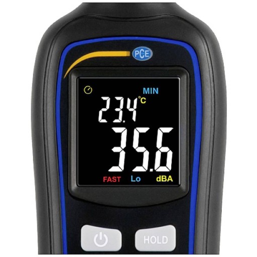 Miernik poziomu dźwięku PCE-MSL 1: Miernik poziomu dźwięku z ważeniem częstotliwości A / równoczesny pomiar temperatury / rozdzielczość 0,1 dB / funkcja HOLD / pomiar wartości ekstremalnych / duży zakres częstotliwości / podświetlany kolorowy wyświetlacz LCD. Miernik poziomu dźwięku PCE-MSL 1 to prosty miernik dźwięku. Miernik dźwięku PCE-MSL 1 służy do szybkiego określenia poziomu hałasu otoczenia. Oprócz pomiaru głośności miernik poziomu dźwięku może również określić temperaturę otoczenia. Pomiar szumów tła staje się obecnie ważny w prawie każdej sytuacji. W tym celu pomocne jest użycie prostego miernika poziomu dźwięku, który daje użytkownikowi wstępne wyobrażenie o narażeniu na hałas, który może wystąpić. Wyświetlacz LCD podaje czytelne wyniki pomiarów wykonanych przez miernik poziomu dźwięku. Podświetlenie zostało również zintegrowane z wyświetlaczem. Miernik poziomu dźwięku jest idealny do pomiarów, które muszą być niezależne od lokalizacji.