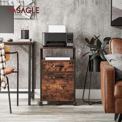 Aby zachować porządek w biurze: dokumenty w otwartej przegródce, długopisy w górnej szufladzie i wiszące teczki formatu A4 lub Letter w dolnej szufladzie... przechowuj swoje artykuły biurowe w tej biurowej szafce na dokumenty. Co powiesz na wyeksponowanie dekoracji na górze? Połączenie płyty wiórowej i stalowej ramy tworzy rustykalny, industrialny styl. Niezależnie od tego, czy umieścisz tę szafkę na dokumenty w swoim gabinecie, biurze, salonie, sypialni czy pod biurkiem, jest to dobry wybór. Panele boczne z otworami: Po bokach otwartej półki znajdują się stalowe panele z otworami, które zapobiegają wypadaniu przedmiotów z półki, nadają one również industrialny akcent szafce i dodają stylowego akcentu Twojemu miejscu pracy. Trio elastyczności, stabilności i bezpieczeństwa: Ta szuflada biurowa jest wyposażona w 5 kółek (2 z hamulcami); kółko pod szufladą zapobiega jej przechylaniu się przy otwartej szufladzie. Dodatkowo szuflady są zamykane na klucz, co zapewnia większe bezpieczeństwo ważnych plików. Łatwy montaż: dzięki łatwym do wykonania instrukcjom i ponumerowanym częściom mobilna szafka na dokumenty będzie gotowa, zanim jeszcze zdecydujesz, gdzie umieścić ją w biurze. Codzienna praca biurowa jest wystarczająco ciężka, więc ułatwimy ją. Dane techniczne: - Kolor: rustykalny brąz, czarny - Materiał: płyta wiórowa, stal - Rozmiar produktu: 44 x 42 x 69 cm (gł. x szer. x wys.) - Waga produktu: 17,4 kg - Maks. Nośność statyczna: 60 kg Zawartość opakowania: - 1 x szafka na dokumenty - 1 x zestaw montażowy - 1 x instrukcja