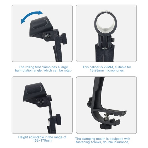 3. Ten odporny na wstrząsy klips do mikrofonu ma regulowaną wysokość w zakresie 152 ~ 179 mm, swobodnie się rozciąga i jest wyposażony w blokadę.