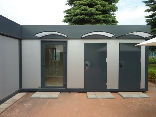 - Dach: Płyta warstwowa z rdzeniem styropianowym o grubości 100mm i przenikalności termicznej 0,38w/m2k