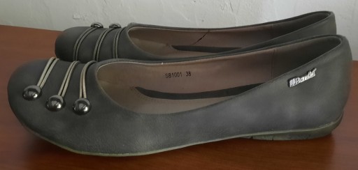 Wygodne , na gumowej podeszwie nowe baleriny w rozmiarze 38. Kolor między khaki , a brązem. Logo marki po zewnętrznej stronie butów. Cena atrakcyjna z powodu dwóch różnych odcieni sznureczków ozdobnych na noskoch.