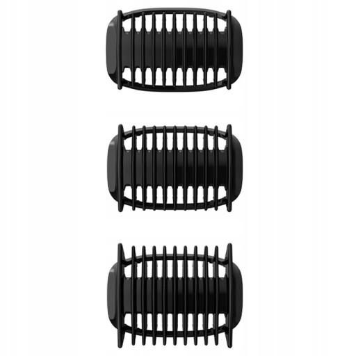 3 nasadki grzebieniowe do włosów na ciele o różnej długości. Aby przyciąć włosy do długości 3, 5 lub 7 mm, należy zamocować nasadkę na golarce. Golarkę można stosować bez nasadki, aby uzyskać dokładniejsze golenie. W przypadku grubszych włosów zaleca się przycinanie wstępne z użyciem nasadki grzebieniowej.