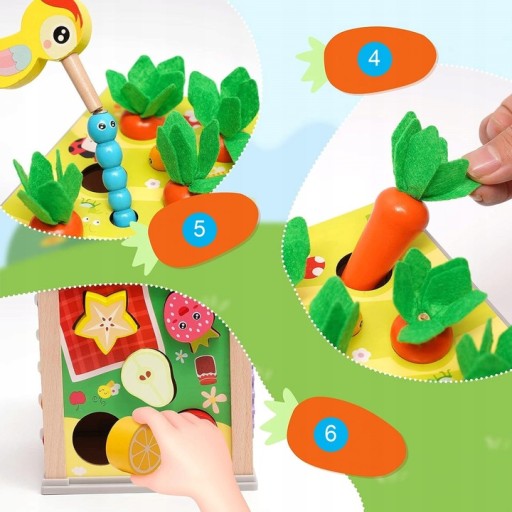 Wyjątkowa gra drewniana to doskonały pomysł na zajęcie malucha. Zabawa polega na chwytaniu drewnianym ptaszkiem zakończonym magnesem robaczków ukrytych w otworkach znajdujących się w owocu a następnie na ich ponownym wkładaniu oraz wyciąganie marchewek za pomocą rączek.