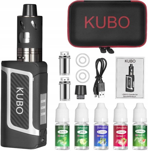 Kompletny zestaw e-papierosów: 1 x mod box 80 W + 1 x zbiornik parownika 3,0 ml + 2 x dodatkowe cewki parownika 0,5 Ω + 1 x dodatkowy ustnik + 4 x dodatkowe uszczelki + 1 x kabel USB do ładowania + 1 x torba do przechowywania + 1 x instrukcja obsługi + 5 x 10 m E-liquid bez nikotyny (jabłko, truskawka, mięta, arbuz, jagoda). (liquidy otwarte, widoczne ubytki)
