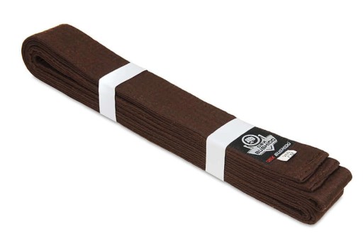 Brązowy pas do kimon stosowanych w sportach walki wykonany z materiału stanowiącego mieszkankę poliestru i bawełny zapewniającą odporność na przetarcia i rozerwania.