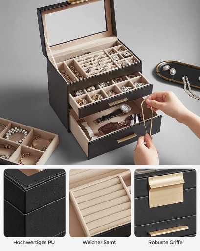 - Eleganckie połączenie kolorów czarnego i złotego, lekko mieniące się metalowe uchwyty, miękka aksamitna podszewka, starannie wykończone szwy, wysokiej jakości PU, solidna płyta MDF - te elementy łączą się w szykowną i trwałą szkatułkę na biżuterię.