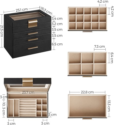 ✔ 4 poziomy z licznymi przegródkami na naszyjniki, bransoletki, pierścionki i kolczyki.